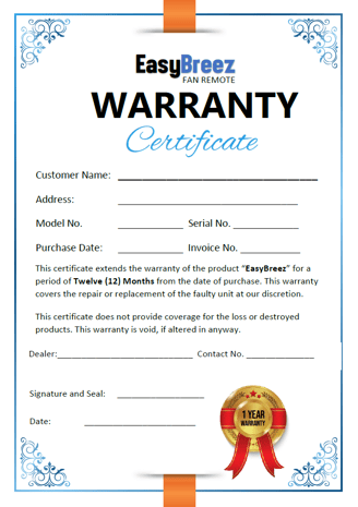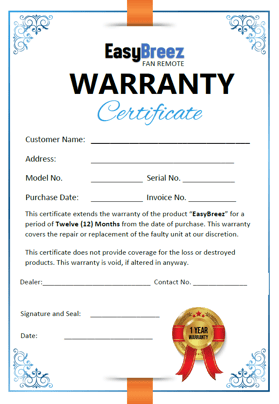 EasyBreez comes with 1 year Product Replacement Warranty. Warranty Certificate is Attached to the User manual.